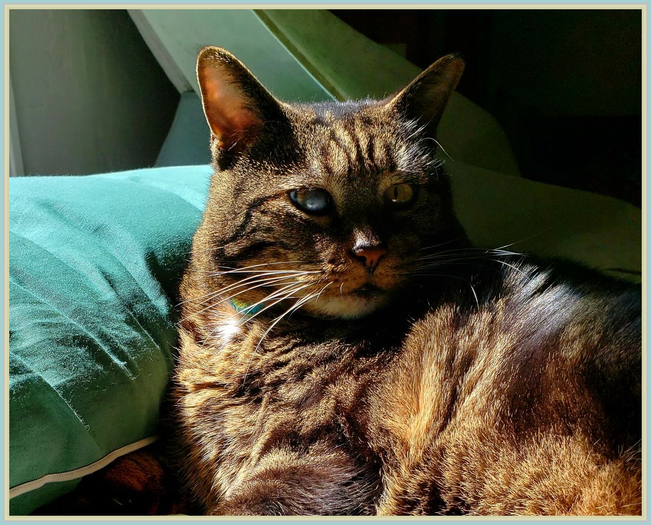 His name, like his little sweet self, came to us more than ten years ago. I was meditating while looking through a bedroom window when a beautiful cat walked across my field of vision. I went outside to investigate; he toppled on his side, and purred when I skritched his face. “Geronimo” was the name on his collar; the collar (which also bore a telephone number) and his glossy coat told me he was well-cared for by someone, although his clipped ear proclaimed him to be feral and his bum right eye declared some sort of accident. A puzzle.